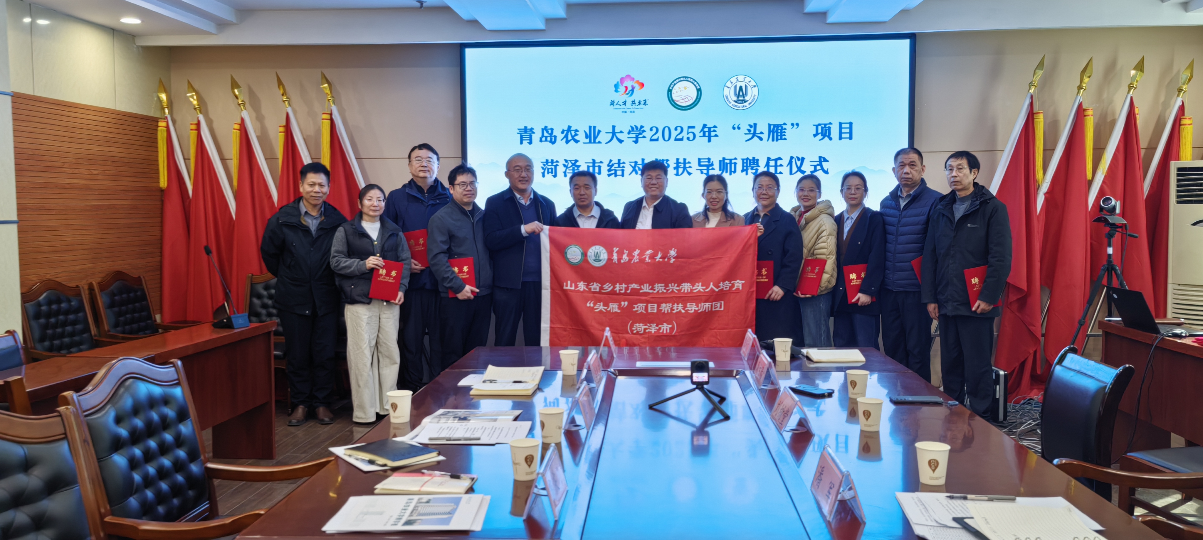 潘军详细介绍了学校“头雁”项目的开展情况,为地方帮扶导师颁发聘书,并向导师团授团旗,对下一步育后帮扶工作做了安排部署。菏泽、枣庄两地农业农村部门负责人均高度认可青岛农业大学校地联合帮扶、共促“头雁”成长的务实举措,表示将全程做好跟踪服务与统筹协调,携手探索打造可复制、可推广的乡村人才培育新模式、新路径。