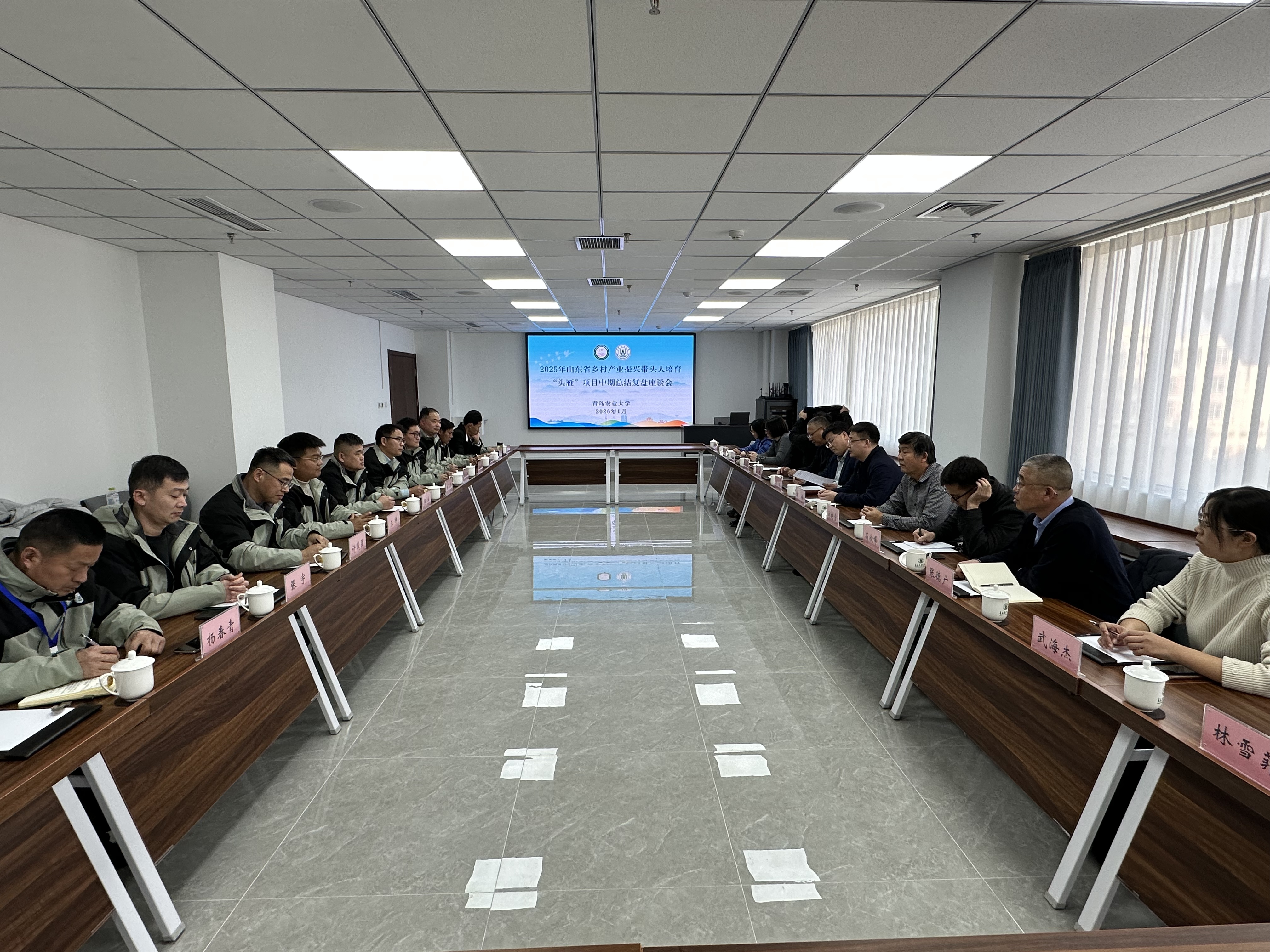 近日,2025年乡村产业振兴带头人培育“头雁”项目中期总结复盘座谈会暨帮扶指导实施方案研讨会在青岛农业大学博学楼召开。会议聚焦“总结培训经验,研讨跟踪帮扶方案,推动‘头雁’项目高质量发展”主题,旨在回顾集中培育成效,凝聚各方智慧,共谋未来培育帮扶路径,为“头雁”学员持续成长构建坚实支撑。青岛农业大学继续教育学院院长潘军、副院长郝伟等6位管理人员,资源与环境学院教授刘树堂、农学院教授石岩、动漫与传媒学院教授高欣峰、食品科学与工程学院副教授于春娣以及专业班主任农学院副院长张恩盈、食品科学与工程学院副教授慕鸿雁6位校内专家,11位2025级“头雁”学员代表参加了座谈交流。